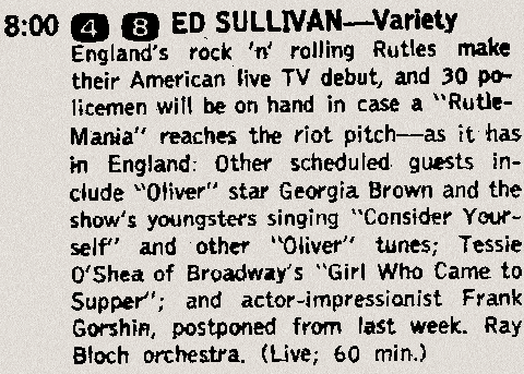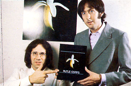 ![]() The Rutles Photo GalleryRutles Album Covers and Picture Sleeves mtr.jpg - The cover of the Rutles' very first LP on Parlourphone, Meet The Rutles, PMC 1202 (mono) and PCS 3042 (stereo), released March 22, 1963. (32k) hmh.jpg - The rare original picture sleeve of Hold My Hand/Number One, the Rutles' first single released in the U.S. on Capatol Records, Capatol 5112, released December 26, 1963. (47k) ahdr.jpg - The cover of the Parlourphone LP A Hard Day's Rut, PCS-3058, released July 10, 1964. (97k) ouch.jpg - The cover of the Parlourphone LP Ouch!, PCS-3071, released August 6, 1965. (70k) srodcb.jpg - The cover of the Parlourphone LP Sgt. Rutter's Only Darts Club Band, PCS-7027, released June 1, 1967. (66k) tht.jpg - The cover of the Parlourphone LP Tragical History Tour, PCTC-255, first released in the U.S. on November 27, 1967. Issued originally in the UK as an EP, SMMT-1. (111k) sr.jpg - The cover of the Shabby Road LP, PCS-7088 on the Rutles Corps label, released September 26, 1969. This album was also released later pressed in shabby greyish vinyl. (94k) lir.jpg - The cover of the Let It Rot album/movie/law-suit, PXS-1 on the Rutles Corps label, released May 8, 1970. (45k) Other Rutlistic Pics button.jpg - An artifact of Rutlemania, this is an I Love The Rutles pin-back button from 1965. (19k) cavern.jpg - A photo of the Rutles performing at The Cavern Club, October 1961. (96k) goys.jpg - The cover of Leggy Mountbatten's book A Cellerful Of Goys which is about his experiences as the Rutles' manager. (15k) leather.jpg - A picture of the Rutles before their first trip to Hamburg, including Leppo, the original fifth Rutle. (77k) leggy.jpg - A picture of the Rutles' manager, Leggy Mountbatten, on the site of the live worldwide TV broadcast of Love Life in 1967. (23k) myronnie.jpg - A picture of the very rare promotional 45 of My Ronnie by "Tony Sheridan and the Rut Brothers", recorded by the Rutles (with Leppo and before Barry) while they were in Hamburg in June, 1961. (23k) rcorps.jpg - A photo of Nasty and Dirk in New York in 1968, announcing the formation of Rutle Corps. (35k) rooftop.jpg - A photo taken at the Rutles rooftop concert for the Let It Rot album/movie/law suit. (73k) ruddles.jpg - The origin of the group's name, a label from a bottle of Nasty's favorite beer, Ruddles County English Ale, brewed in Rutland. Nasty was drinking this beer when Dirk bumped into him on the first day they met. (23k) rutland.jpg - The cover of the Rutland May 1960 CD, one of the many releases of the recordings of the Rutles made in Hamburg prior to being signed with Parlorphone. (35k) rutles.jpg - The original colour photo of The Rutles that was used in black and white on the Hold My Hand picture sleeve. It includes the cigarette in Dirk's hand, which was later air-brushed out by Capatol Records. (45k) sr_full.jpg - The original uncropped photo of the Rutles used on the cover of the Shabby Road album, taken outside Rutle Corps headquarters in London. (61k) srt.gif - The cover of a bootleg CD called Sweet Rutle Tracks, containing early live rehearsal performances by the Rutles. (50k) tea.jpg - A photo of the Rutles in their Sgt. Rutter's uniforms, holding their controversial cups of tea. (90k) tvguide.gif - A copy of the listing in TV Guide for the Ed Sullivan Show on February 9, 1964, the Rutles' first live appearance on American television. (15k) This page last updated September 21, 1997. All files described on these pages are for educational use only. Individuals may copy these files for their personal use only, for academic study of the source material. They are not to be redistributed commercially. |